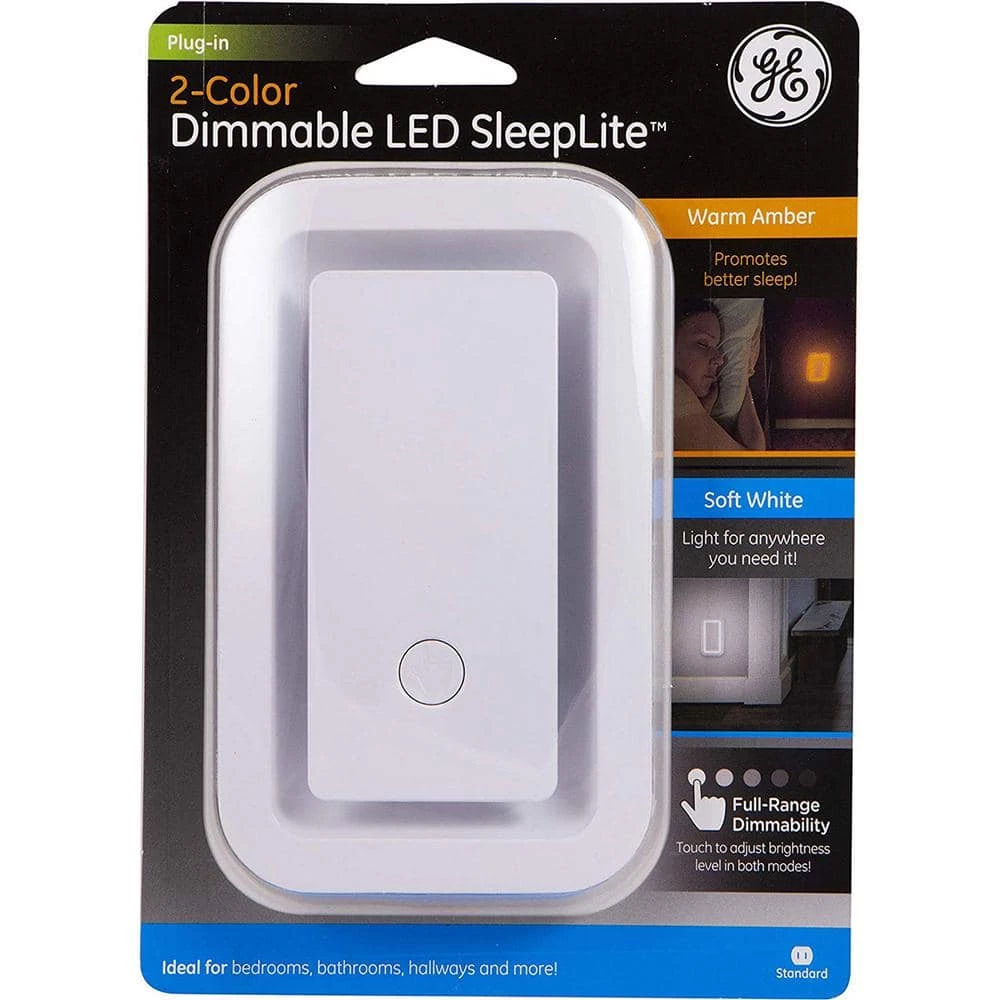 Sleep soundly with a GE-branded Amber/White LED Dimmable SleepLite. The SleepLites LEDs distribute a tranquil nighttime glow without the blue wavelengths that disturb your body’s natural sleep cycle. The blue light emitted by our electronic screens including tablets, phones, computers and televisions can suppress the body’s production of melatonin (or the sleep hormone), meaning exposure to excessive LED blue light at night can disrupt our natural internal clocks. The SleepLite yields virtually no blue light, supporting healthy melatonin levels that tell our bodies it’s time for rest. The SleepLite features two LED colors: warm amber and white. To switch between colors, simply tap the button at the base of the light. You can also dim the light on either color by tapping and holding the same button. Additionally, there’s no need to unplug the SleepLite during the day the unique light sensing technology helps keep energy costs down by automatically turning on at dusk and off at dawn. The SleepLite conceals your entire outlet and comes in a sleek white finish. Enjoy fewer disruptions to your sleep cycle with a GE-branded Amber/White LED Dimmable SleepLite.