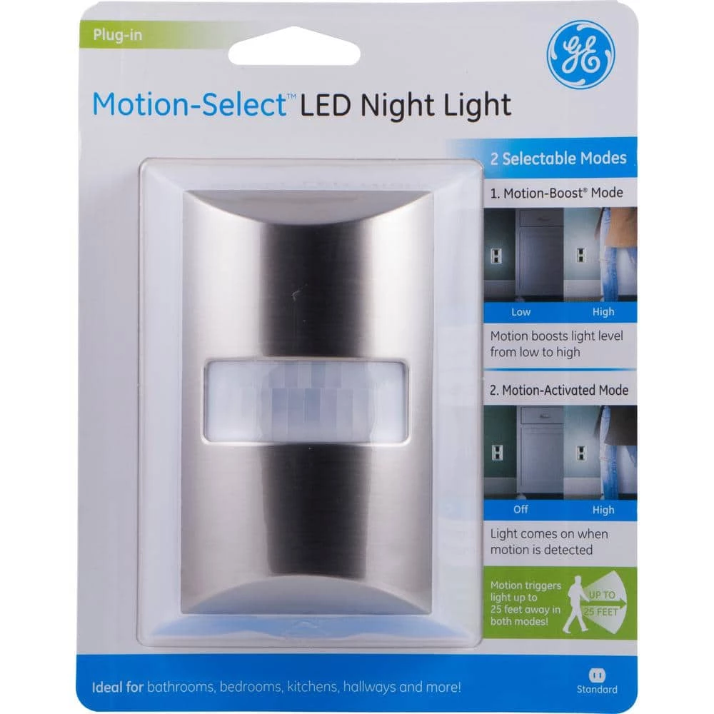 Keep your night glowing with a GE Motion-Selecta LED Night Light. Featuring bright, energy-efficient LEDs, the plug-in night light is perfect for bedrooms, staircases, bathrooms and more. Choose from 2 motion detection settings. In Motion-Boost mode, when motion is detected within a range of up to 25 ft., the night light automatically brightens from 3 lumens to 60 lumens, creating enough illumination to safely move about a dim room or hallway. After 90 seconds without sensing motion, the night light will return to 3 lumens. In Motion-Activated Mode, when motion is detected within a range of up to 25 ft., the night light automatically turns on at 60 lumens. After 90 seconds without sensing motion, the night light turns off. There’s no need to unplug the motion-select night light during the day – the night light includes unique LED light-sensing technology, which helps keep energy costs down by automatically turning on at dusk and off at dawn. Sleep soundly at night with your GE Motion-Selecta LED Night Light.