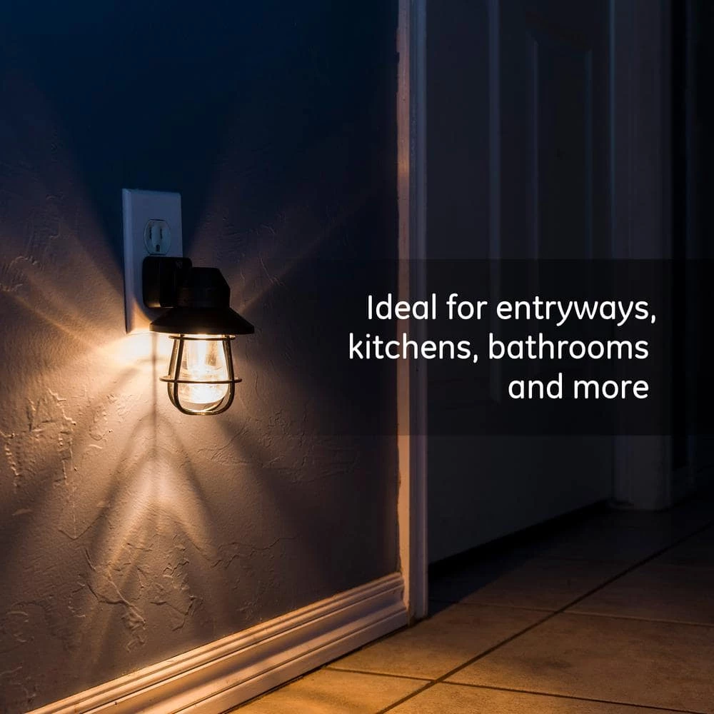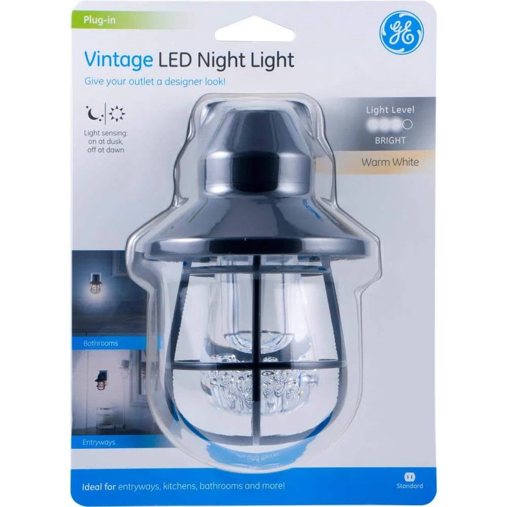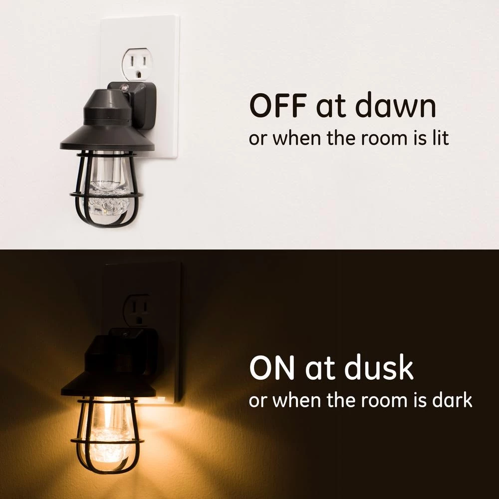 Give nighttime a nostalgic glow with the GE Vintage LED Night Light. The plug-in night light recreates an early 20th century look, featuring an Edison inspired acrylic bulb and an industrial inspired black hood with an open cage design. The warm, antique illumination of the vintage night light creates a cozy, soothing atmosphere for your evenings. The night light is perfect for bedrooms, staircases, hallways, bathrooms and more.?There’s no need to unplug the night light during the day – the built-in light sensing technology helps keep energy costs down by automatically turning the night light on at dusk and off at dawn. You can position the night light to conceal your entire outlet, or free up your second outlet by using only the top receptacle. Add a touch of radiant, urban farmhouse to your home at night with the GE Vintage LED Night Light.