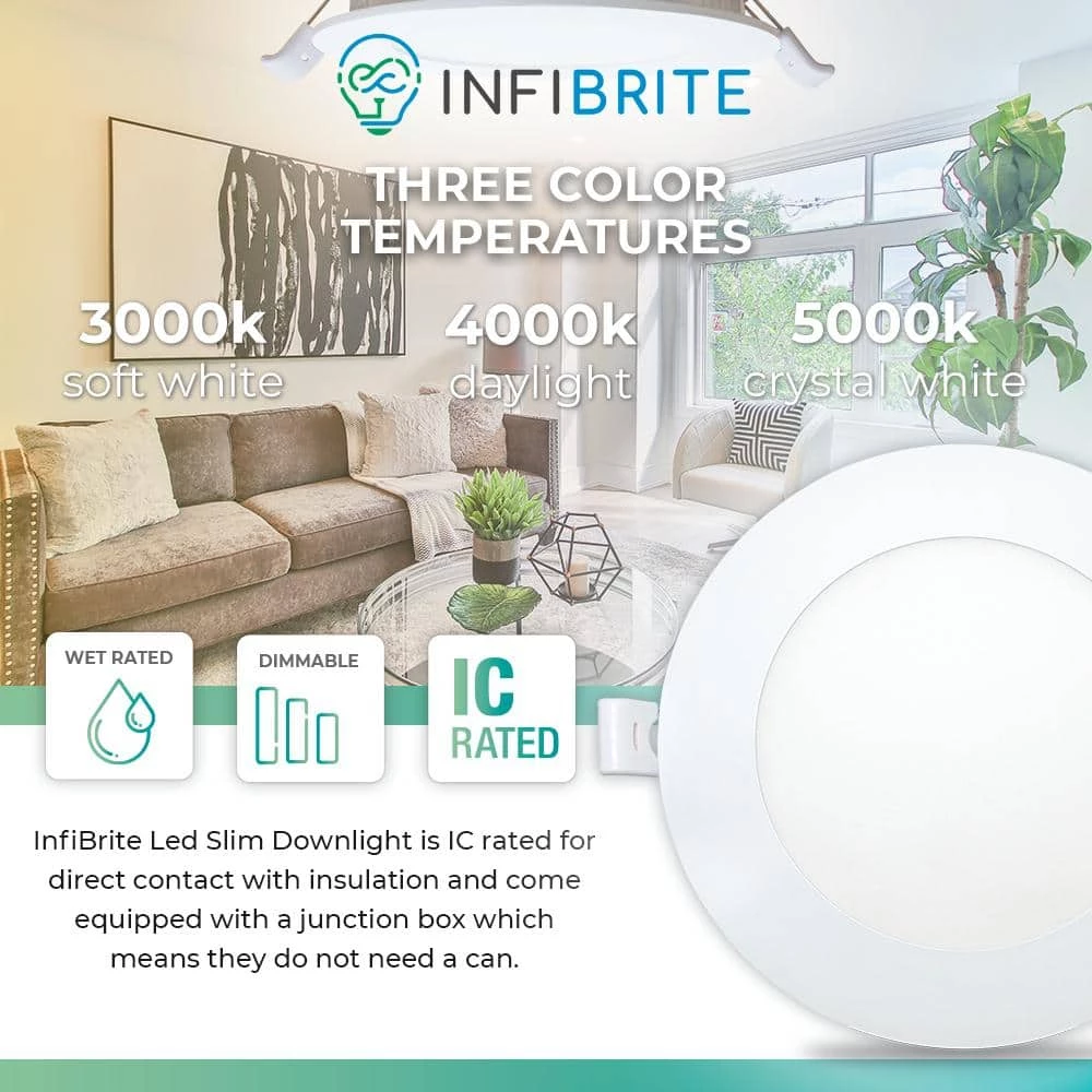 The InfiBrite Ultra Slim Color Selectable Recessed Lighting Kits are the recessed lights you are looking for. Whether moving into a new space, remodeling or simply updating lights, proper lighting plays a huge role in elevating the appearance of your room. At InfiBrite, we make choosing the perfect light easy with our LED lights. Not only is each fixture is designed specifically for tight spaces where height clearance is limited such as below beams or ductwork, you can choose the perfect color temperature with a flip of a switch. Using the integrated color changing switch you can choose between a 3000K (Warm White), 4000K (Cool White) or 5000K (Daylight White) to select the perfect color to match your room. 3000 Kelvin is perfect for a relaxing soft color, 4000 Kelvin is the ideal choice for everyday tasks and 5000 Kelvin is great for a hallway, work area or to simply keep a room brightly lit. ENERGY STAR certified and IC rated for direct contact with insulation, these lights won’t overheat, have a compact junction box and will last for-years to come, 50000-hours or approximately 34-years if used for 4-hours per day to be exact. Wet rated and certified airtight, Our lights are perfect for your bathroom, drop ceilings, outdoor soffits and all general lighting applications.