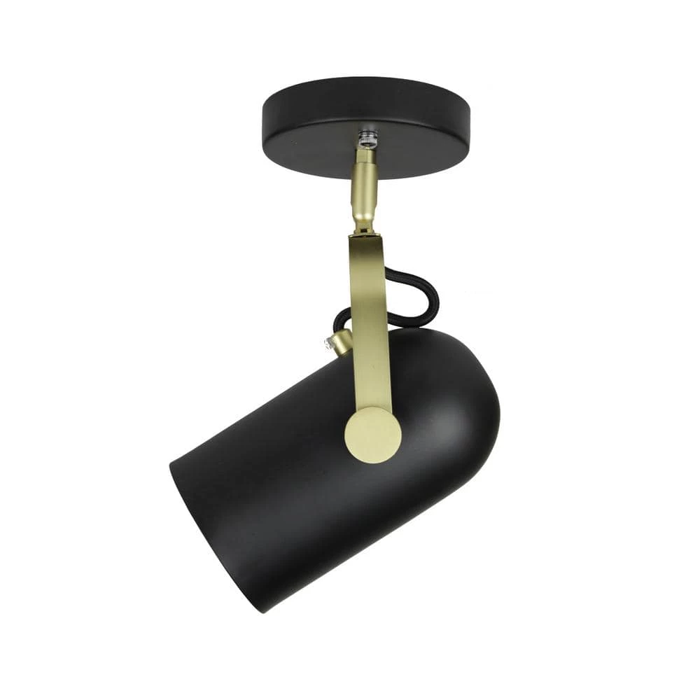 Industrial Theatrical Ceiling Semi Flush lamp, Spot Light Type. 1 light with E26-E27 lamp holder (medium base) with black finished and gold elements. Shade is adjustable 360 degrees with directional spot light. Must be hard wired installation on dry locations. It looks great on industrial and exposed concepts.