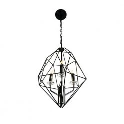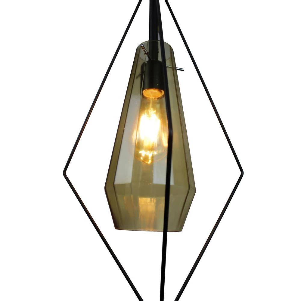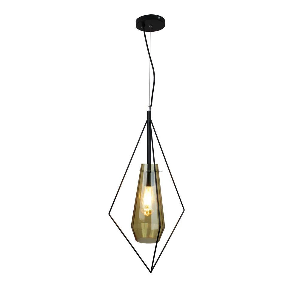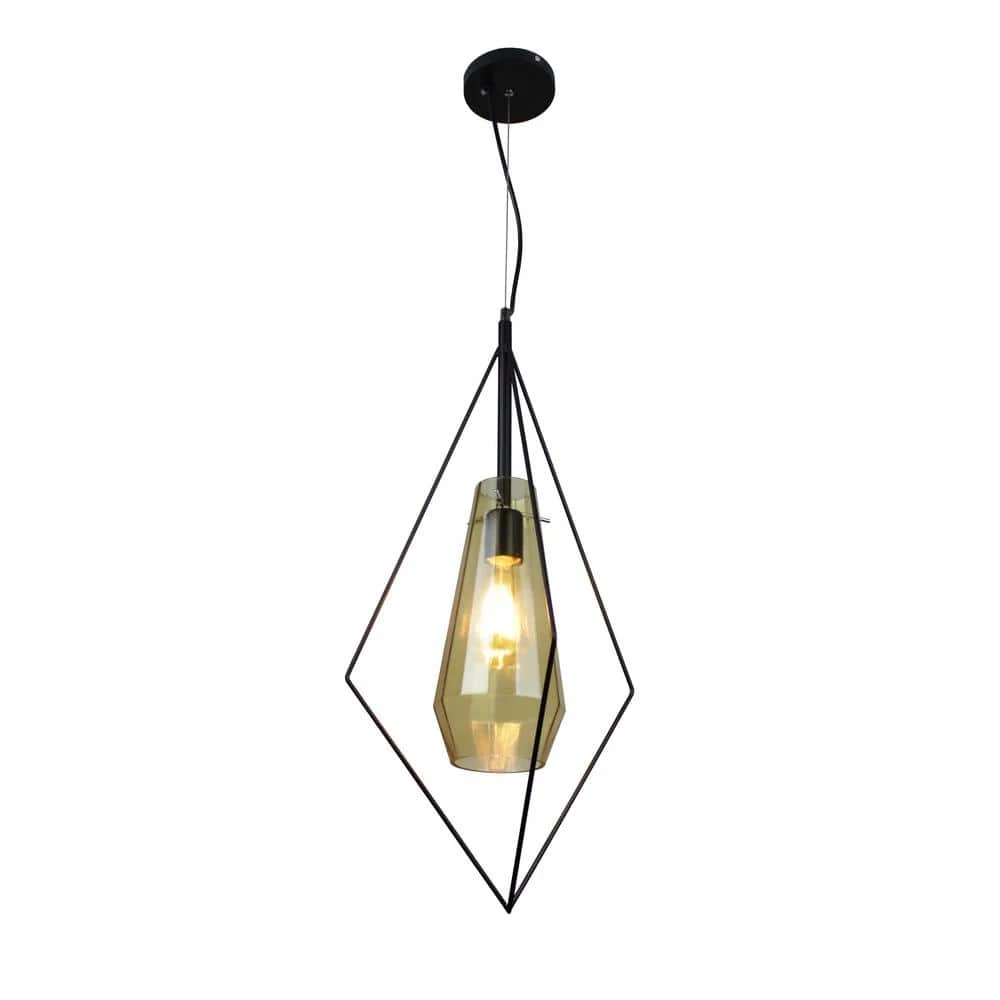 Here is the Itzia Pendant with black finished and an amber glass shade at the center. It comes with an adjustable 8 ft. black cord and black canopy. With an Rhombus shape pendant and a glass shade in diamond kind shape, is great for open spaces or for living and dining areas.