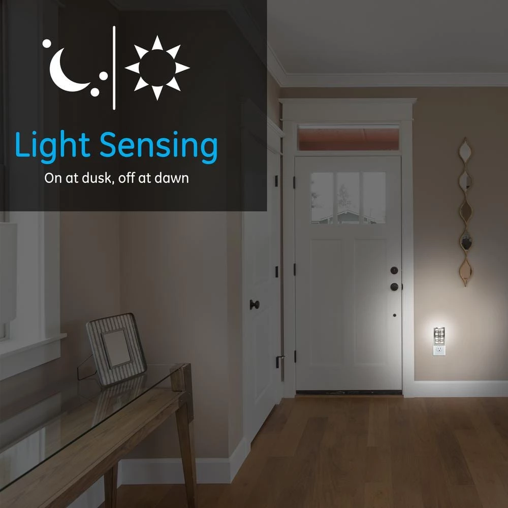 Cover unsightly outlets while providing a soft glow with the GE-branded LED CoverLite Night Light. This LED night light is designed to fully cover two outlets when one is not in use, though it can be positioned to keep second outlet free for use. It features light sensing technology which automatically turns the night light on or off with the changing room light. Simply put, when the lights go down, the night light turn on, when the lights go up, the night light turns off. This night light features a stylish brushed-nickel finish, modern design and always cool-to-the-touch bulbs that make it a perfect fit for any room in your home. The long-life LEDs mean there will be no bulbs to replace and it is energy-efficient, using just pennies’ worth of electricity per year. The night light’s stylish finish, modern design and always cool-to-the-touch bulbs make it perfect for any room in your home. Add light with a designer look to your home with the GE-branded LED CoverLite Night Light. It is intended for indoor use only. This product is UL-listed and comes with a limited-lifetime warranty.