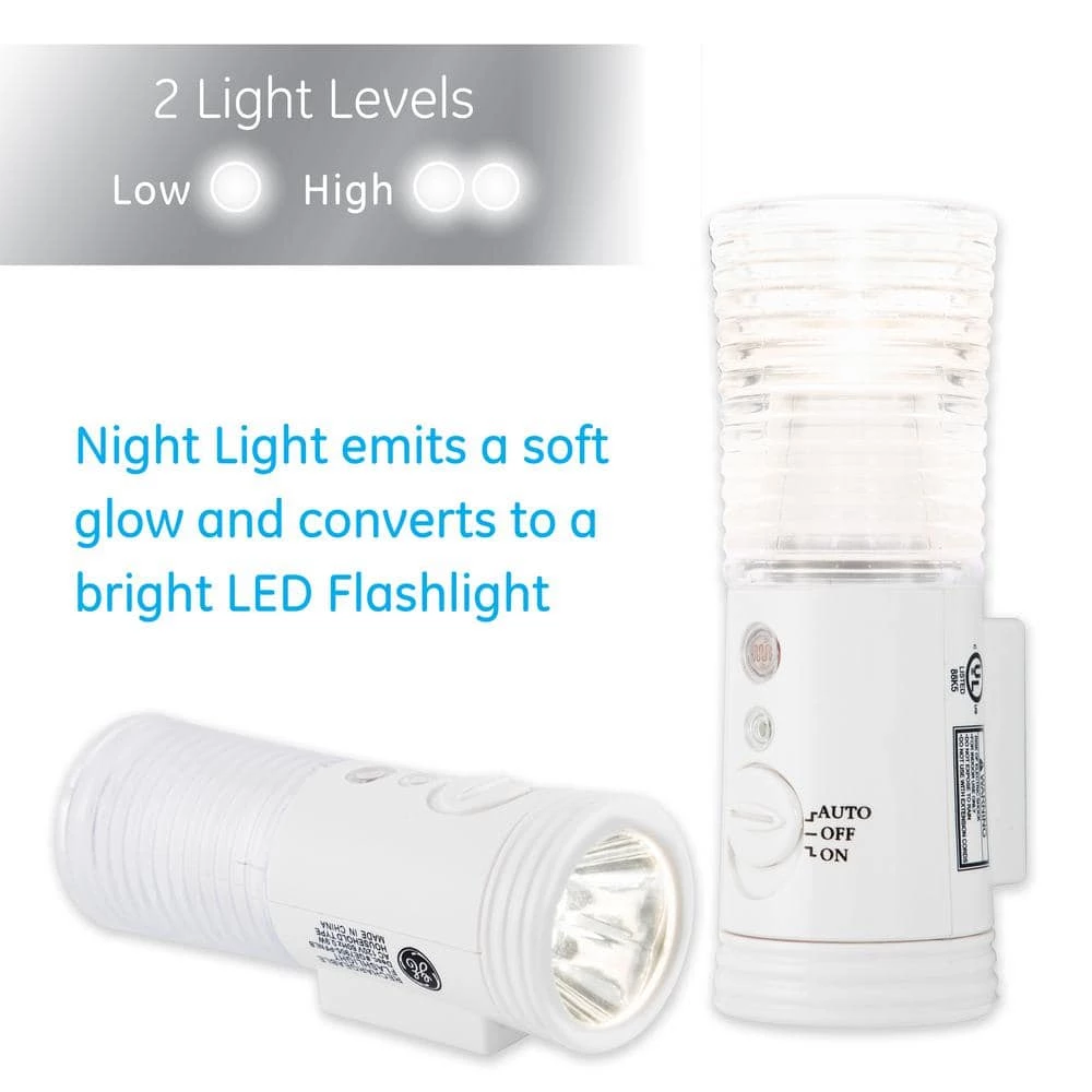 The GE Rechargeable LED Power Failure Night Light will help guide you through emergencies. It offers three products in one – portable flashlight, night light and power failure night light. During regular use, this innovative LED night light emits a soft glow. During a power outage, it instantly comes on and can be used as a portable flashlight. Simply remove it from the wall. This night light includes a light sensor which turns it on at dusk and off at dawn. The retractable plug makes it easy to store when not in use. This product comes with a limited lifetime warranty.
