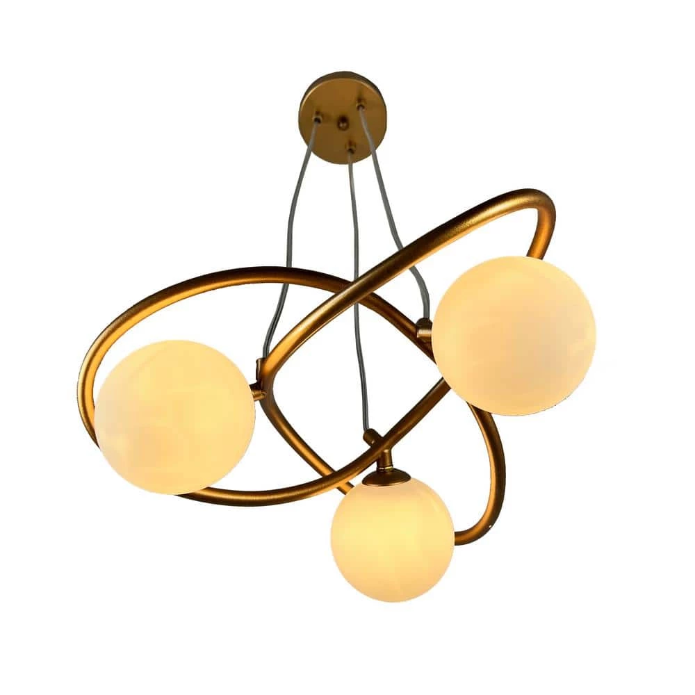 From the Mid Century Collection here is the Xaman Chandelier Pendant with 3-Light, and 3 white frosted glass globe and satin brass finished body. A beautiful circular chandelier with 3 tiers in different directions. It requires G9 bulb Bi-pin. We suggest no more tha 5W. A great chandelier for living and dinning areas.