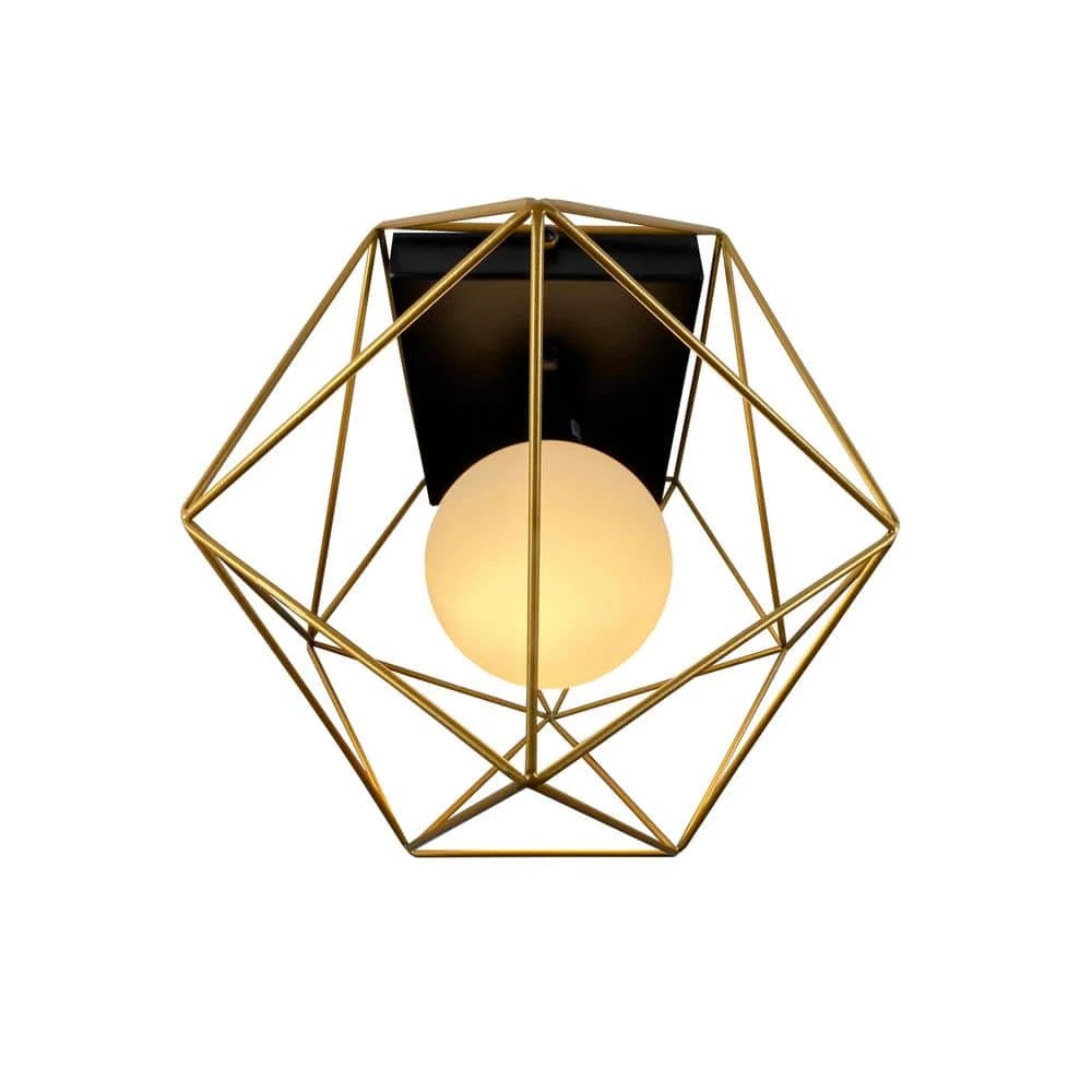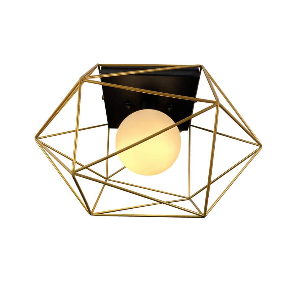 From the Modern Industrial Collection. Here is the Yumil Geometric Ceiling Semi Flush light fixture in Black and Gold finished. It comes with one 4 in. Dia frosted white glass globe shades. The ceiling canopy is 4.75 in. x 4.75 in. in black matte. A perfect fit for bathrooms, vanity light, or any designated area. It may also be used as a Wall Sconce.