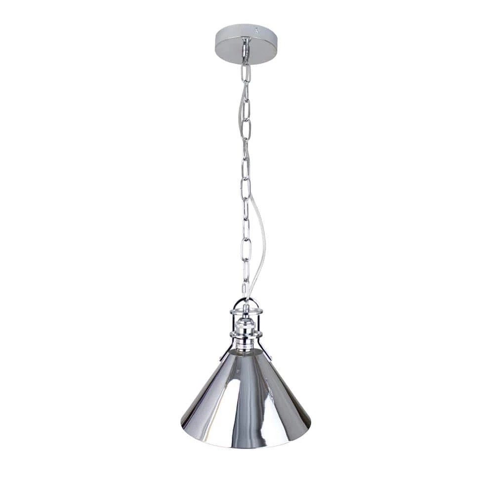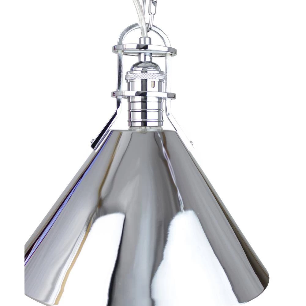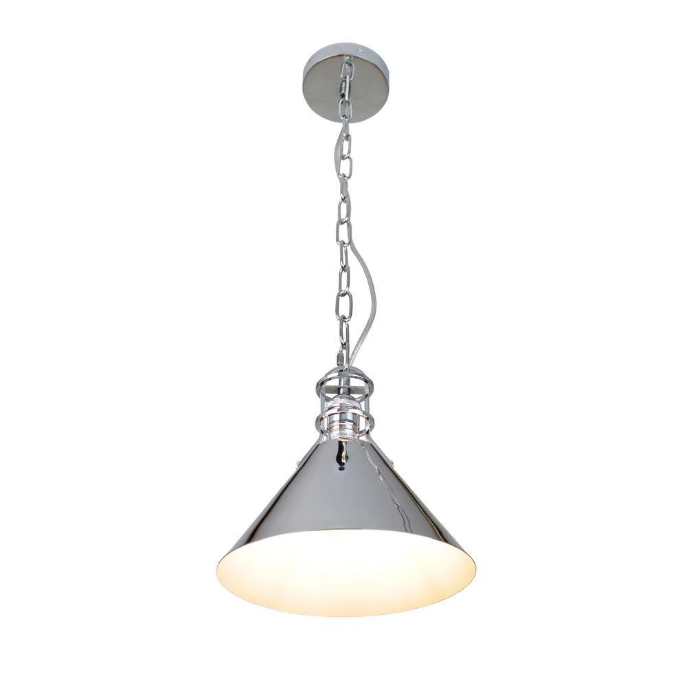 Here is the Zulia Cone pendant with chrome finished. It comes with an adjustable 8’ft chrome chain and clear cord to hang. Also comes with a chrome canopy. Includes all necessary accessories to install. Is a great pendant for kitchens, dinning areas and for mid century or modern spaces.